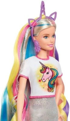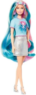 Einhorn oder Meerjungfrau? Die Barbie Fantasie-Haare Puppe muss sich nicht entscheiden – sie hat zwei Fantasie-Looks, die jeweils einen bunten Haarreif mit Extensions, ein passendes Oberteil und Accessoires enthalten. Die Verwandlung in eine Meerjungfrau oder ein Einhorn ist ganz einfach! Einfach das T-Shirt mit dem Einhorn- oder dem Meerjungfrauen-Aufdruck anziehen und dann den dazu passenden Haarreif aufsetzen. Die bunten Extensions am Haarreif lassen Barbies lange blonde Haare, die schon pinkfarbene, blaue und glitzernde Strähnen enthalten, in noch mehr Farben erstrahlen. Ihr schimmerndes Partykleid wird im Handumdrehen zum dritten Look.