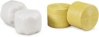 Die vier sortieren Rundballen, je zwei Stück gewickelt (schwarz) und ungewickelt (ockerbraun) passen ideal zu dem Ballenwickler.