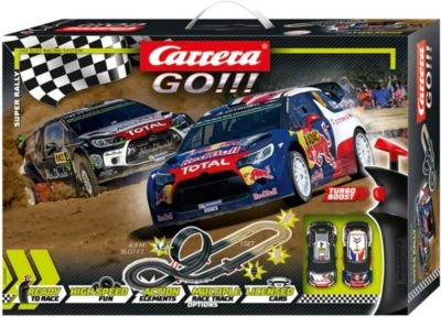 – Geraden: 2x Gerade 342 mm, 5x Gerade 114 mm, 2x Rally Engstelle, 1x GO!!! Anschluss-Schiene, 1x Rundenzähler-Schiene, 1x Looping Set