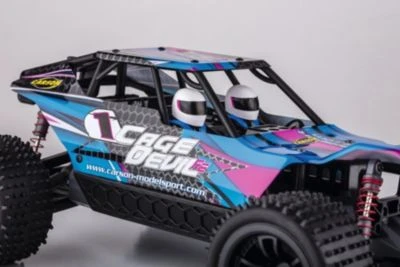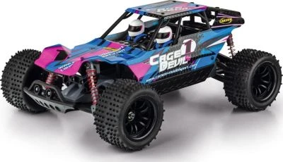 Für coole Rennen und Outdoor-Action bestens ausgestattet: Mit dem ferngesteuerten Cage Devil FE von CARSON kommt ein Powerpaket auf die Piste! Ob auf gerader Strecke oder bei rasanten Kurvenfahrten: der Cage Devil ist ein Truggy mit Differenzial-Getriebe und einer unglaublichen Spitzenleistung von bis zu 35 km/h. Das extrem gefederte Chassis, die coolen Offroad-Reifen mit ausreichend Grip und der Spritzwasserschutz machen den Cage Devil zu einem Kletterkünstler auch bei feuchtem Untergrund. Die LED-Scheinwerfer sorgen für eine gute Sicht auch bei Dämmerung und die dynamisch gestaltete Karosserie mit Rennfahrer-Profi am Steuer sind auf jeden Fall ein Hingucker. Der Carson-Racer wird mit Fernsteuerung, High Power LiIon-Fahrakku mit Schnell-Ladegerät geliefert und ist nach dem Aufladen sofort startklar.