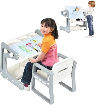 Unser Kinder-Zeichenbrett mit Stuhl wird dauerhaft Freude bereiten und Ihre Kinder durch ihre Kindheit begleiten. Dieses 2-in-1-Kindermalbrett mit Stuhl kann zudem als Tisch verwendet werden, und Sie können es im Winkel verstellen, um es zu einem Zeichenbrett zu machen. Sowohl die Tischplatte als auch die Unterseite des Tisches sind mit Einkerbungen versehen, sodass Ihr Kind genügend Platz hat, um darin Marker, Radiergummi, Spielzeug und andere Kleinigkeiten aufzubewahren. Das geruchlose HDPE-Material und die abgerundeten Ecken dienen der Sicherheit Ihres Kindes. Die bequeme Rückenlehne stützt den Körper des Kindes. Untersetzer verhindern effektiv, dass der Boden zerkratzt wird. Der Tisch lässt sich mit nur wenigen Handgriffen aufstellen, wodurch Sie Zeit und Energie sparen.