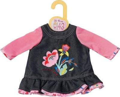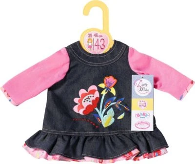 Das süße Outfit besteht aus einem hübschen Jeanskleid mit pinken Ärmeln. Die Blumen-Applikationen auf dem Stoff in Jeans-Optik sind besonders raffiniert gestickt. Am Saum des rüschigen Rocks und an den Ärmel schaut ein verspieltes Blütenmuster hervor. Das Kleidungsset erweitert die Spielmöglichkeiten, regt die Fantasie an und fördert kreatives Rollenspiel.