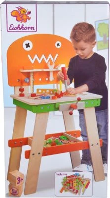 In der 40-eiligen Werkbank von Eichhorn findet alles seinen Platz! Dazu gehören die Säge, der Schraubstock, der Schraubenschlüssel und viel weiteres Zubehör wie Schrauben, Muttern und Verbindungselemente. Im unteren Ablagefach kann man diese Kleinteile gut zu verstauen.