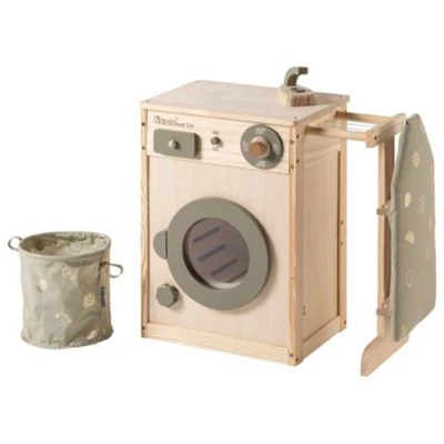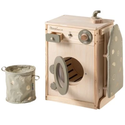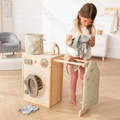 • Die Kinderwaschmaschine aus Holz wird mit drehbarer Waschtrommel, Drehknopf mit Klickgeräusch, Wäscheleine, Wäschekorb, Bügelbrett und Bügeleisen.