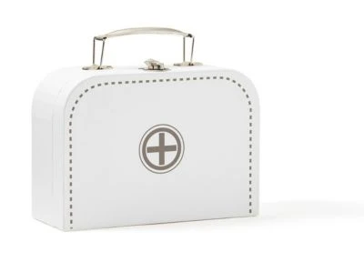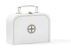 Arztkoffer in weiß von Kids Concept mit Stethoskop, Thermometer, Zungenspatel, Pillendose, Salbe, ausziehbarer Spritze und Reflexhammer. Die Instrumente sind aus robustem Buchgenholz gefertigt. Toller Spielspaß, da mit dem Arztset nicht nur der Teddy, sondern auch Mama und Papa gepflegt werden können.