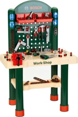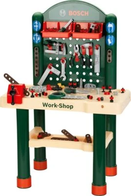 Der Bosch Workshop 8461 mit sensationellen 82 Zubehörteilen ist das neue Must-have für kleine Baumeister und moderne Handwerker. Mit Säge, Hammer, Schraubstock, Winkel, Zange uvm. zaubert die Werkbank mit ihrer Arbeitsplatte mit anregenden Lernfunktionen im Handumdrehen kreative Atmosphäre in jedes Kinderzimmer. Da werden die Großen staunen und die kleinen Bastler begeistert sein. Auf geht´s!
