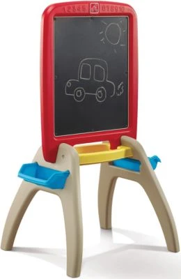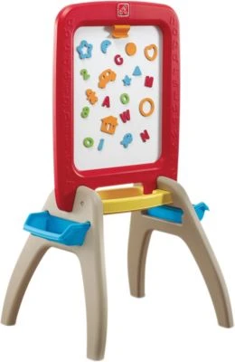 All Around Staffelei für zwei. Sie passt in jedes Kinderzimmer. Während auf der einen Seite wunderbar mit Magneten gespielt werden kann, dient die andere Seite zum Malen auf der Tafel.