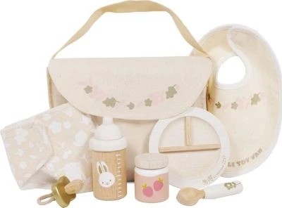 Tolle Alltagshelfer für kleine Puppen- und Kuscheltier-Eltern. Dieses bezaubernde Puppen Wickel Set von Le Toy Van begeistert mit einer praktischen Umhängetasche mit Umschlag und vielen nützlichen Utensilien für die Puppenkinder. In dem Täschchen finden sich ein Lätzchen, Schnuller, Windel, Teller, Löffel, Babynahrung und ein Fläschchen. Die Verarbeitung von Baumwolle und Holz macht das Spielset robust und die zarten Pastellfarben sind zeitlos schön.