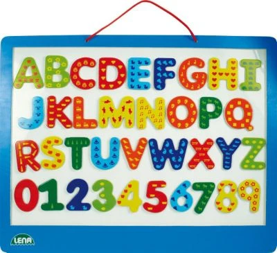 Wie schreibt man den eigenen Namen? Viele tolle Möglichkeiten entstehen mit der Magnettafel und den neuen Buchstaben. A wie Apfel, B wie Blume usw., auf jedem Buchstaben sind Bilder abgebildet, die mit diesem Buchstaben anfangen.