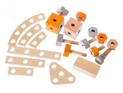 Viel Zubehör, das beliebig kombiniert, an- und abgeschraubt werden kann (Schrauben, Muttern, Holzbretter mit Löchern, Bausteine mit Löchern )