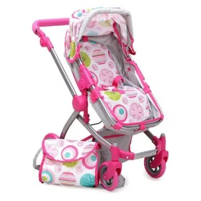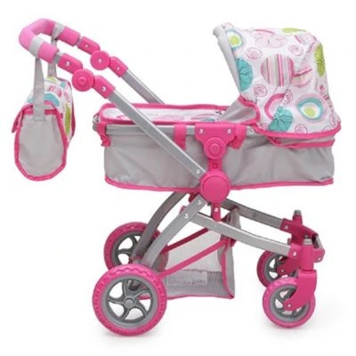 Puppenwagen in pink Puppenwagenaufsatz als Puppenwanne oder Puppen-Sportsitz verwandelbar abnehmbare Abdeckung verstellbarer Schiebegriff mit Tasche für Puppenzubehör Ablagekorb unter dem Puppenwagen verstellbares Sonnendach Zubehörtasche