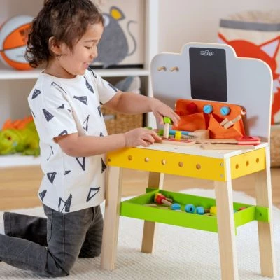 Für alle Handwerker*innen und Bastel-Fans! Mit dieser stabilen „Werkbank“ von myToys kommt ein umfassend ausgestatteter „Arbeitsplatz“ für Werkeleien aller Art. Der Tisch ist aus zertifiziertem Holz in kräftigen Farben gestaltet und steht mit vier stabilen Füßen sicher auf dem Boden. Mit den vielen Werkzeugen, wie Säge, Hammer, Schraubenschlüssel und Lineal lassen sich Bauvorhaben in Kombination mit den gelochten Spielbrettern und Schrauben perfekt umsetzen. In der dreiteiligen Tasche können die Werkzeuge griffbereit untergebracht werden. In dem Set enthalten sind viele weitere Zubehörteile, wie ein Winkelmesser, ein Schraubendreher, Lochbretter in verschiedenen Farben, Muttern und Schrauben.