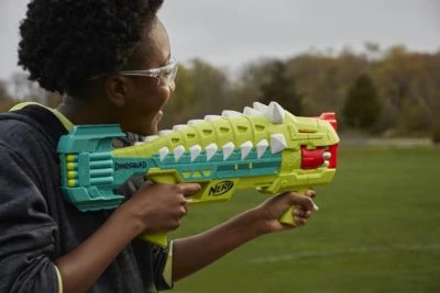 Als Mitglied der Elitetruppe DinoSquad verbünden sich Nerf Fans mit legendären Sauriern. Hier kann die außergewöhnliche Kraft der großartigsten Dinosaurier entfesselt werden, um sich in actionreiche Abenteuer zu stürzen. Mit dem Nerf DinoSquad Armorstrike Blaster von Hasbro ist saurierstarke Action angesagt! Er zeigt coole Dinosaurier-Details und kommt im Look eines Ankylosaurus. Hier können acht Darts in Folge aus der 8-Dart-Rotationstrommel abgefeuert werden, um zu zeigen, dass man jede Menge Dino-Power hat. Einfach den Pump-Griff nach hinten und nach vorne bewegen, um den Blaster vorzubereiten. Der zweite Griff dient zur Stabilisierung beim Abfeuern. Der Blaster kommt mit 16 Nerf Elite Darts – acht Darts, um die Trommel zu bestücken und acht Darts, die zum schnellen Nachladen direkt am Blaster aufbewahrt werden können. Um einen Dart abzufeuern, wird die Trommel bestückt, der Griff bewegt und der Abzug gedrückt. Ein Augenschutz wird empfohlen (nicht enthalten).