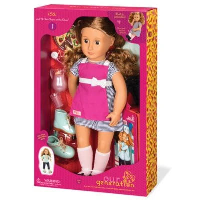 Hier kommt Isa! Diese wunderschöne 46cm große Puppe von Our Generation macht immer eine tolle Figur, egal ob bei der Arbeit oder in ihrer Freizeit! Sie liebt Pizza und Rollschuhfahren, und bringt zwei bezaubernde Outfits mit, die du ihr ganz einfach an- und ausziehen kannst.