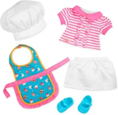 Inhalt: 1 Puppe, 1 T-Shirt, 1 Rock, 1 Schürze, 1 Paar Schuhe, Unterhose, 1 Kochmütze, 2 Haarbänder, 1 Rührschüssel mit Schneebesen, 1 Wellholz, 1 Spritztüte und 1 Backpinsel, 1 Eierbecher, 6 Eier, 1 Muffinblech, 4 Cupcakes, 1 Mehltüte, 1 Rezeptblock, 1 Topfhandschuh