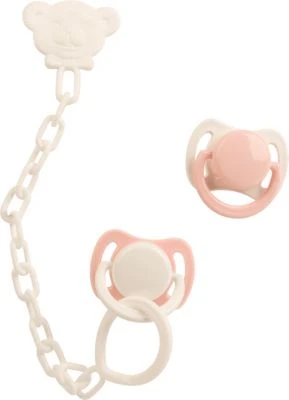 – ein Schnuller mit Bügel und ein Schnuller mit Schnullerkette mit Bärenclip