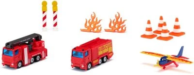 Spannender Rettungsspaß mit dem coolen Feuerwehr-Geschenkset von SIKU: dieses umfangreiche Set enthält verschiedene Fahrzeuge und Zubehör, sodass Einsatzorte sich realistisch nachspielen lassen. Der große drei-Achs-LKW mit Fahrerhaus und Hubrettungsbühne eignet sich optimal, um auch große Höhen zu erreichen. Das Löschfahrzeug unterstützt die Bekämpfung des Feuers vom Boden aus und das Flugzeug aus der Luft. Mit den Pylonen und Barken wird der Einsatzort abgesperrt und die Flammen machen den Spielspaß noch authentischer.