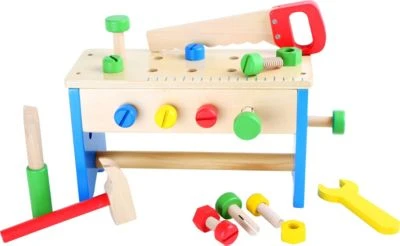 Hier wird gesägt, gehämmert und geschraubt! Die mehrfarbige Werkbank wird im Handumdrehen zum Werkzeugkasten, so können alle Werkzeuge aus hellem Holz nach Gebrauch schnell und unkompliziert verstaut werden. Mit dem Tragegriff lässt sich der Werkzeugkasten auch gut transportieren – so steht weiteren Projekten zum Beispiel bei den GroĂźeltern nichts mehr im Wege – was bauen wir als nächstes?Â