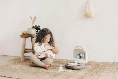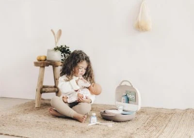 Das praktische Pflegeset enthält zahlreiche Zubehörteile wie eine Puppenwindel, ein Fieberthermometer, eine Haarbürste und einen kleinen Kamm, Baby-Cremelotion, ein Brei-Gläschen, einen Teller mit Löffel, ein Armband und ein Milch-Fläschchen. Die kleine Ablage im Pflegekoffer ist herausnehmbar und kann entweder als normaler Tisch oder als Wickeltisch genutzt werden
