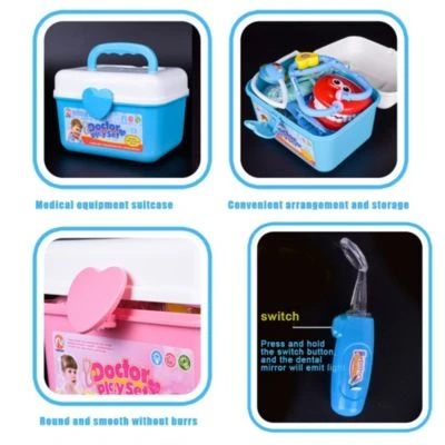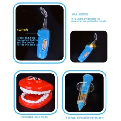 Eine Vielzahl von Doktor Spielzeug, die den Prozess eines Arztes simulieren, der einen Patienten operiert. Die Krankenschwester gibt der Puppe/dem Haustier Injektionen und Medikamente und simuliert die postoperative Versorgung. Der Zahnarzt tut so, als würde er die Mundgesundheit überprüfen.